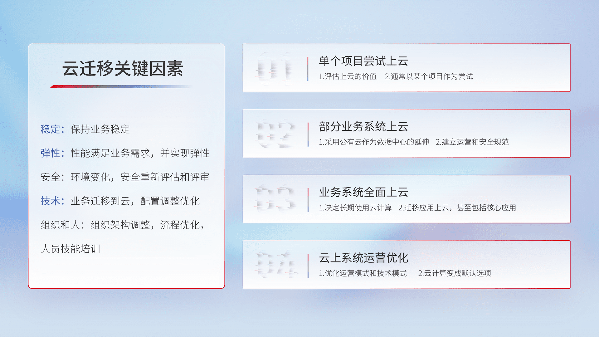 结合实际业务,,从规划设计、、、、云平台选型、、、、云原生改造、、、数据迁移、、、集成交付,,迁移全过程为客户识别最佳上云路径,,,做好风险识别管理,,设计网络架构、、身份权限、、安全审计合规、、操作审计、、、、日志审计、、、、监控告警策略、、、多站点容灾设计等,,,,对云上基础设施进行整体规划,,,,提升IT治理水平,,,以满足弹性、、、高可用、、、、高性能的需求。。。
