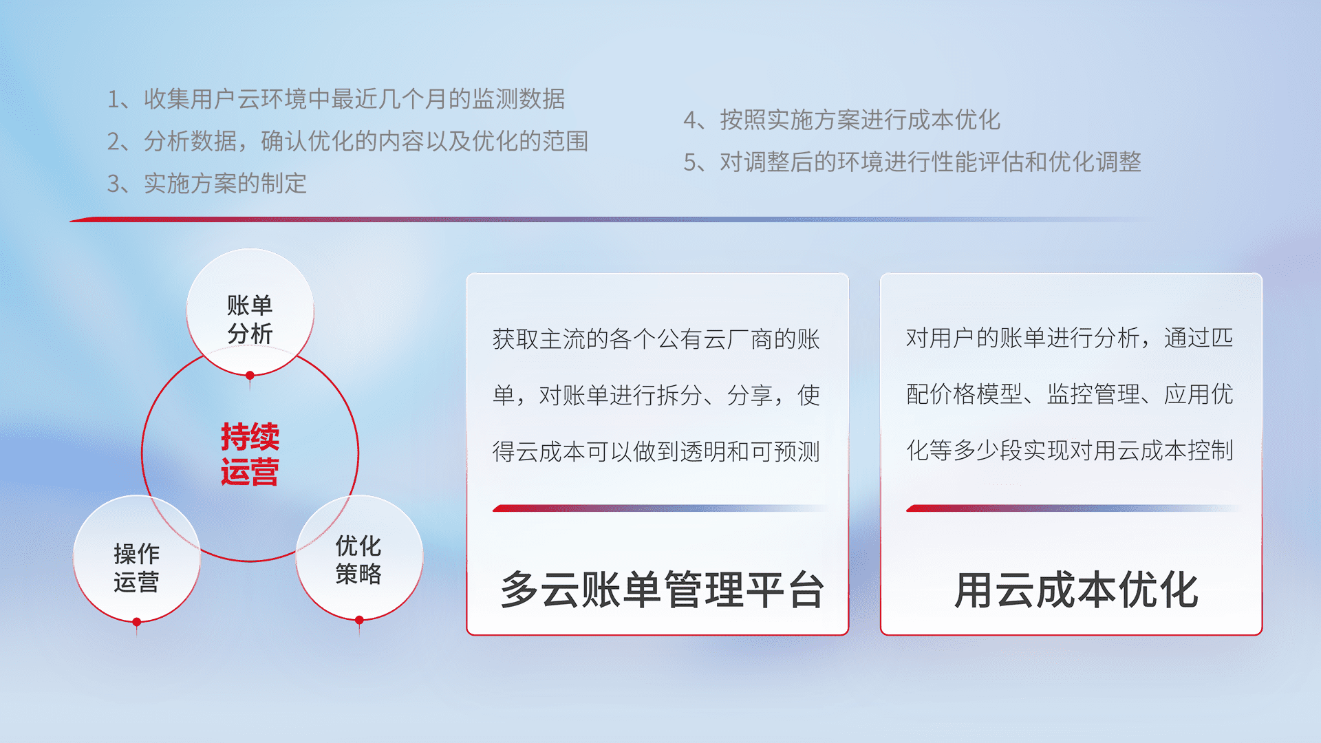 通过多云纳管,,,以统一的资源数据模型把客户的云资源进行抽象和封装,,进而实现对多云资源的统一操作,,保障云资源管理的可靠性、、稳定性与可用性。。量身定制化运维内容,,配置、、、、开发运维、、补丁管理、、、、备份、、监控、、、认证和访问管理、、、审计和日常巡检等,,,保障在用云过程中的可靠度,,,稳定度以及高可用率。。。。